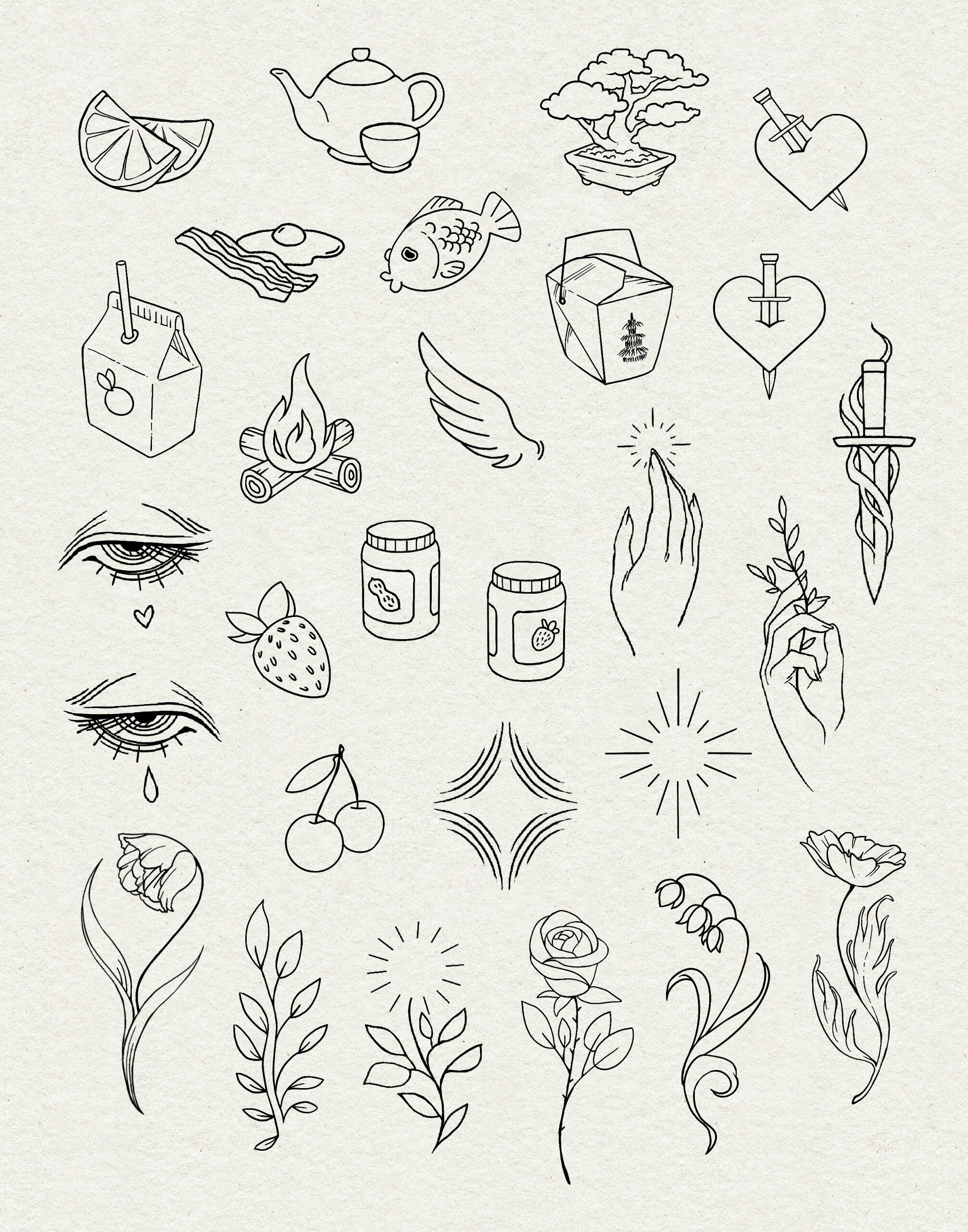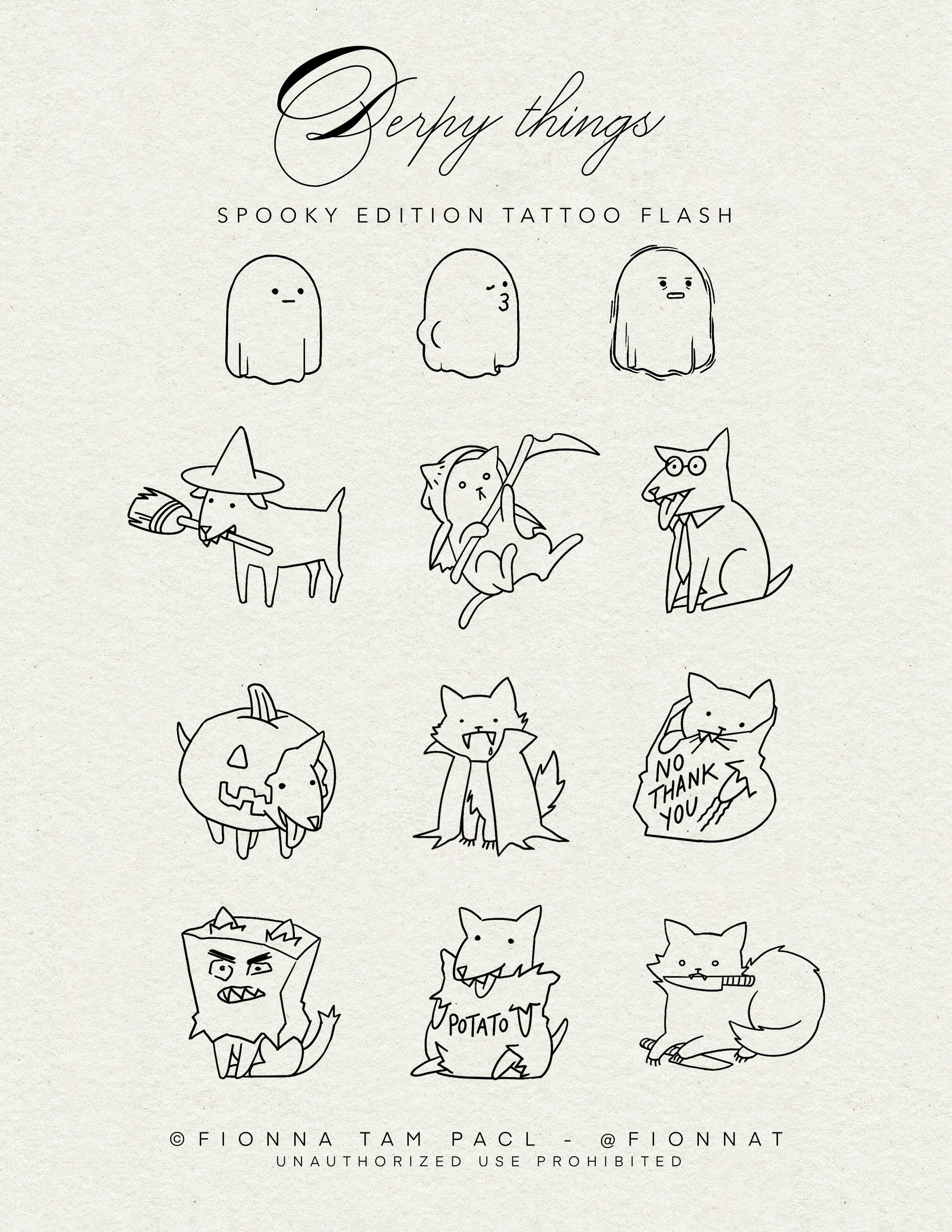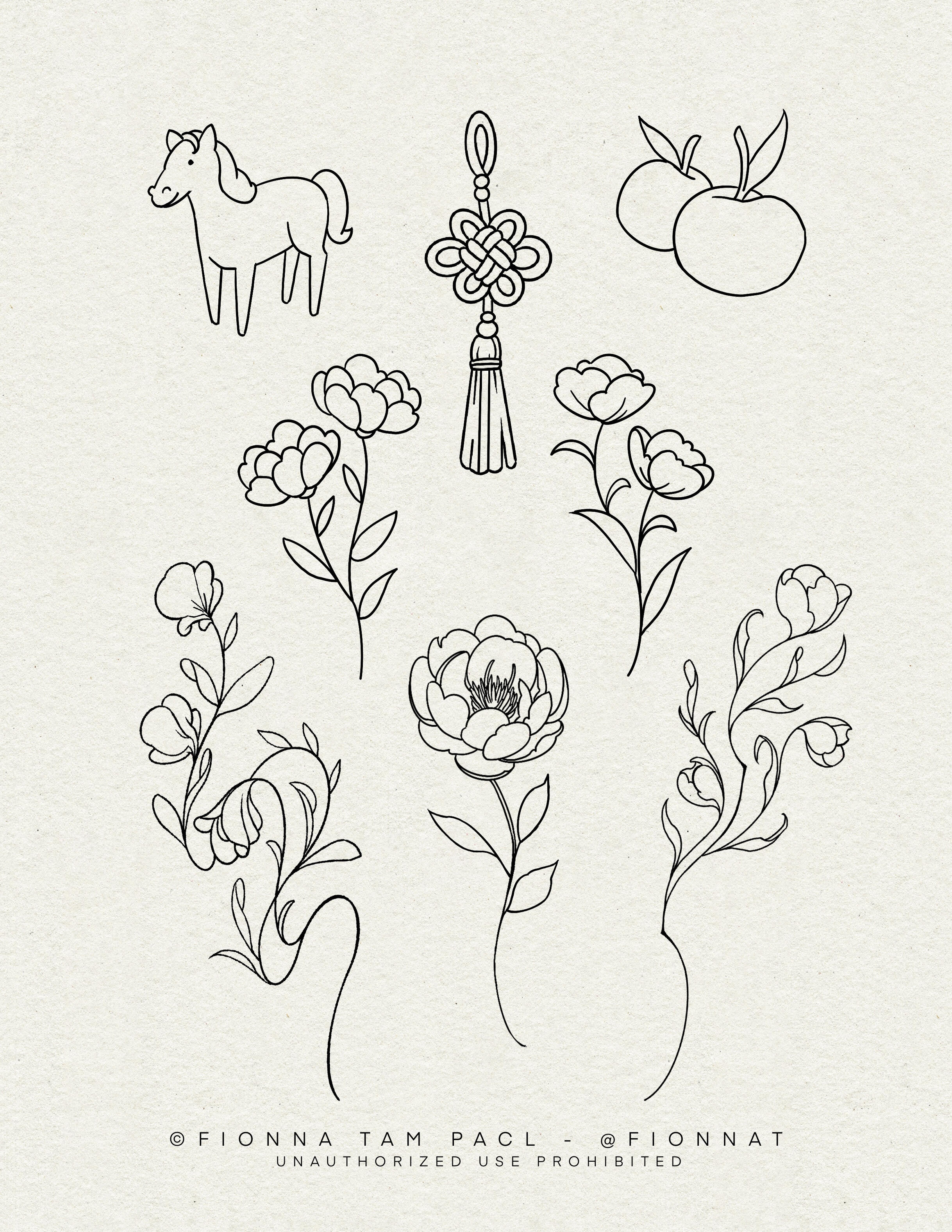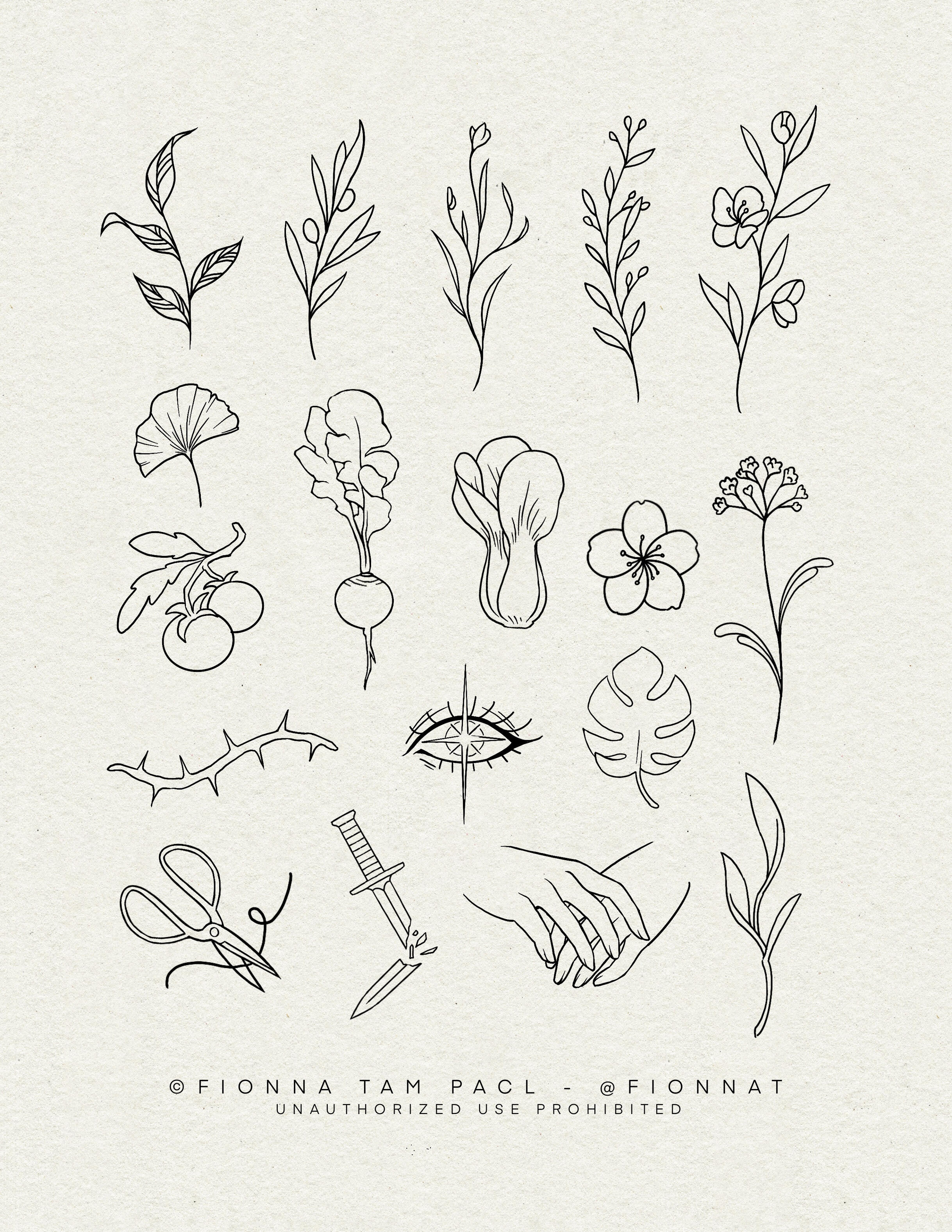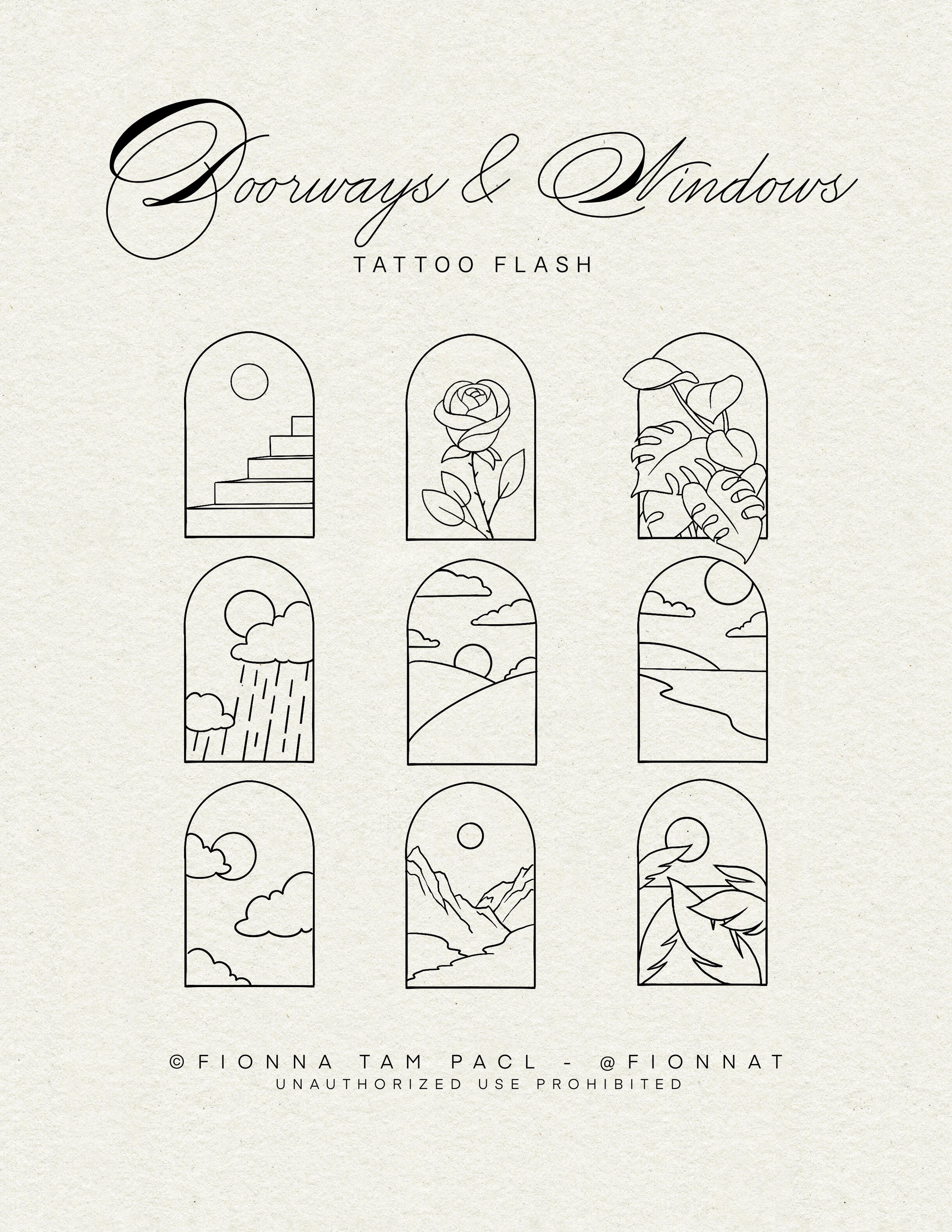 All flash designs on this page are available and may be repeated unless noted otherwise. Each design was created by me, and unauthorized use is not permitted. For tattooed work please see my instagram @fionnat